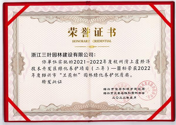 • 2021-2022年度杭州灣上虞經(jīng)濟(jì)技術(shù)開(kāi)發(fā)區(qū)綠化養(yǎng)護(hù)項(xiàng)目(二年)—Ⅲ標(biāo)喜獲紹興市蘭花杯