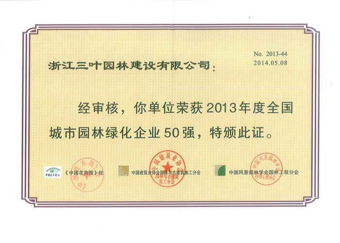 - 2014年5月8日,中國花卉報公布了“全國2013年度城市園林綠化企業(yè)50強(qiáng)”的公告,浙江三葉園林建設(shè)有限公司在中國建筑業(yè)協(xié)會園林與古建筑施工分會、中國風(fēng)景園林工程學(xué)會開展的評選活動中,通過全國100多家園林企業(yè)提交的2013年度財務(wù)審計(jì)報告查驗(yàn)、審核等級程序,經(jīng)過確認(rèn)后,我司被“全國2013年度城市園林綠化企業(yè)50強(qiáng)“企業(yè)。三葉園林此次獲評企業(yè)50強(qiáng),是公司全體同仁秉承“誠信、敬業(yè)、創(chuàng)新”的理念,共同努力的結(jié)果,顯示了企業(yè)實(shí)力及較好經(jīng)濟(jì)效益。